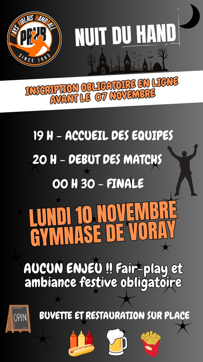 LIEN POUR INSCRIPTION : https://www.helloasso.com/associations/pays-riolais-handball/boutiques/nuit-du-hand